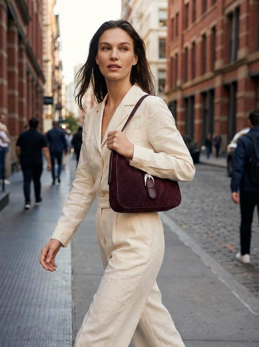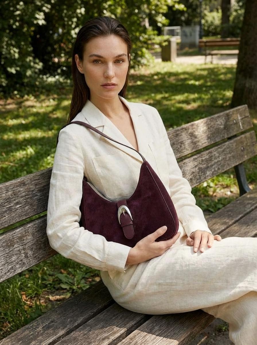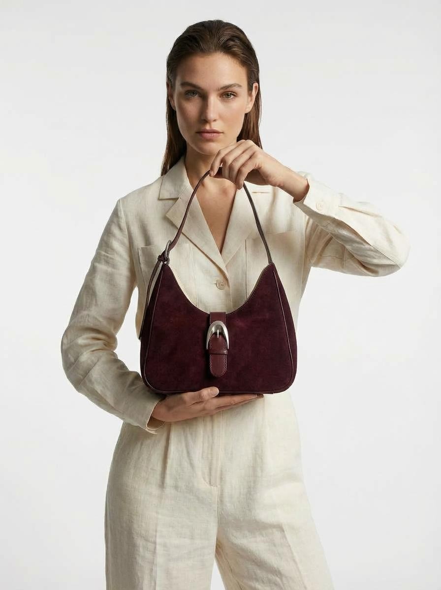 Our Burgundy medium suede buckle bag is crafted with 100% cowhide, featuring soft suede and a buckle fastening. Fully lined with side and zip pocket for safe storage compartment. Leather strap with magnetic buckle for secure fastening.