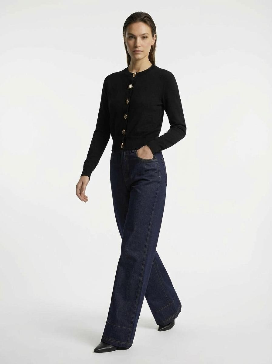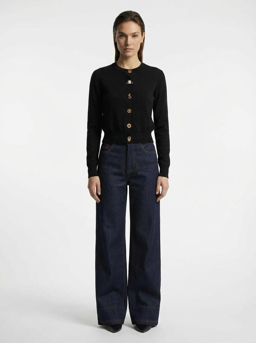 Indulge in luxury with our Black Fitted Cardigan With Unique Gold Buttons. This sophisticated black long sleeve cardigan features stunning gold unique buttons. Elevate your style and make a statement with this exclusive piece. Paired with our 'Saxe Denim Jeans'.