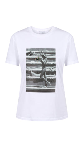 Our pool side relaxed fit t-shirt in white is embellished with a retro camera crystal pin layered over a graphic screen print. Made with organic cotton with a soft hand feel.